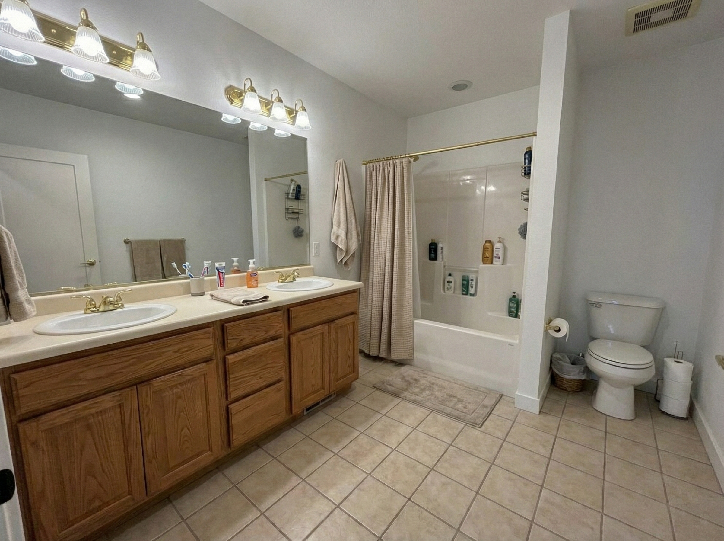 Originally, the bathroom had a standard tub-and-shower combination, oak cabinets, and beige floor tile. The overall look felt dated. The toilet area was separated by a partial wall, which didn’t provide much privacy, especially since the master bathroom was designed to be used by two people at the same time.
