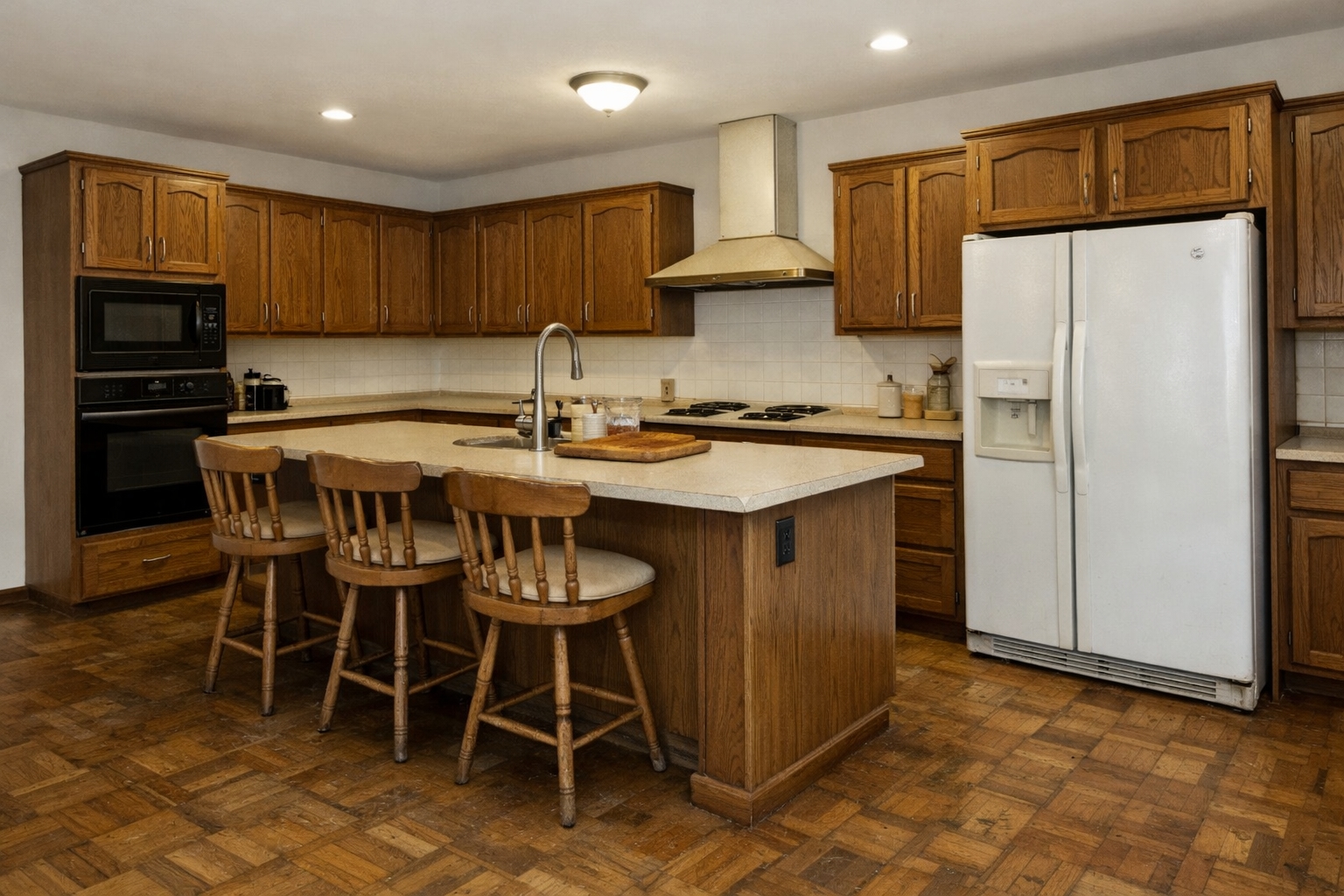This project was a full kitchen renovation that completely transformed the space. The original kitchen had older wooden cabinets, parquet flooring, and a kitchen island with the sink located in the middle of the room.